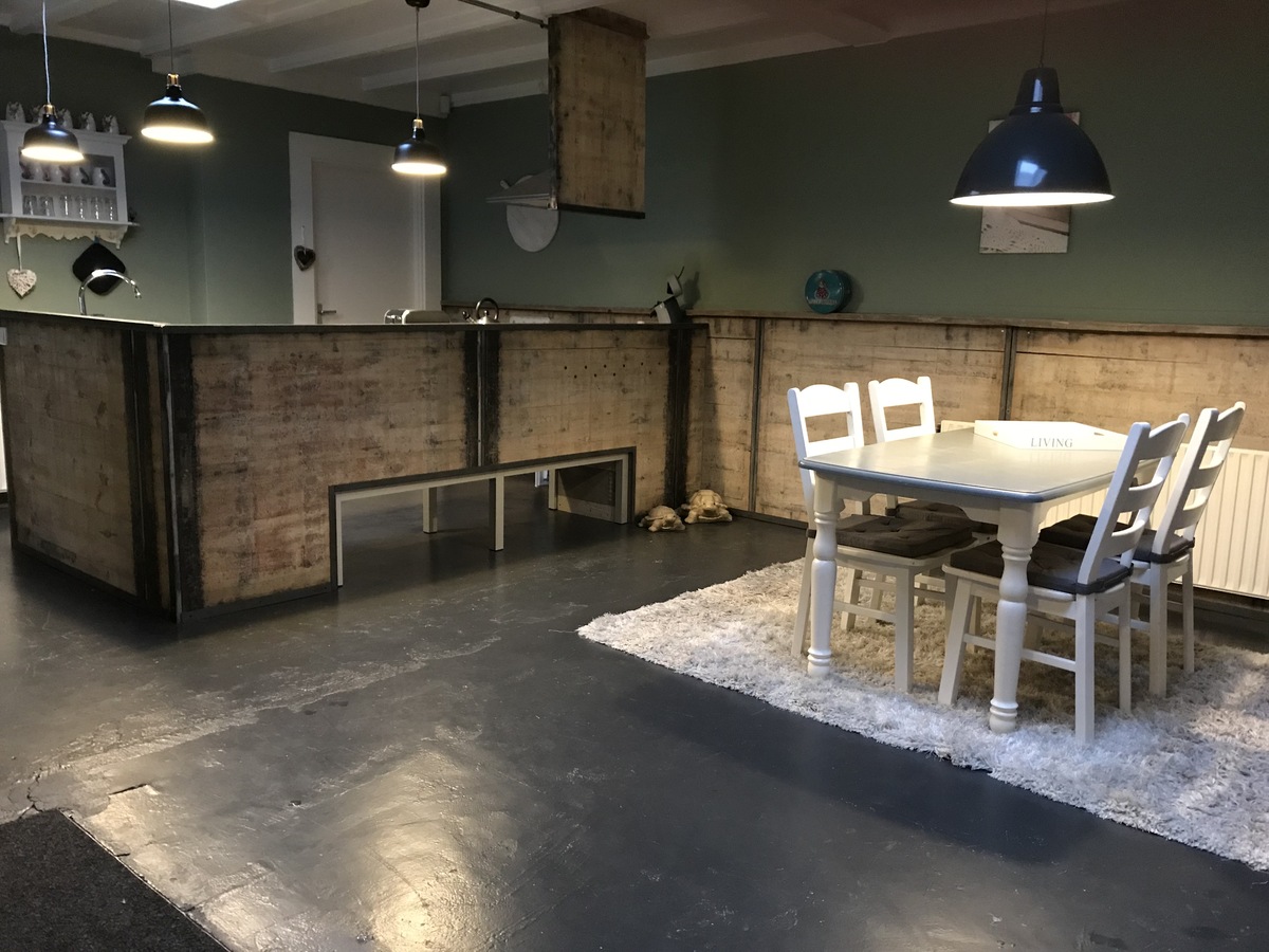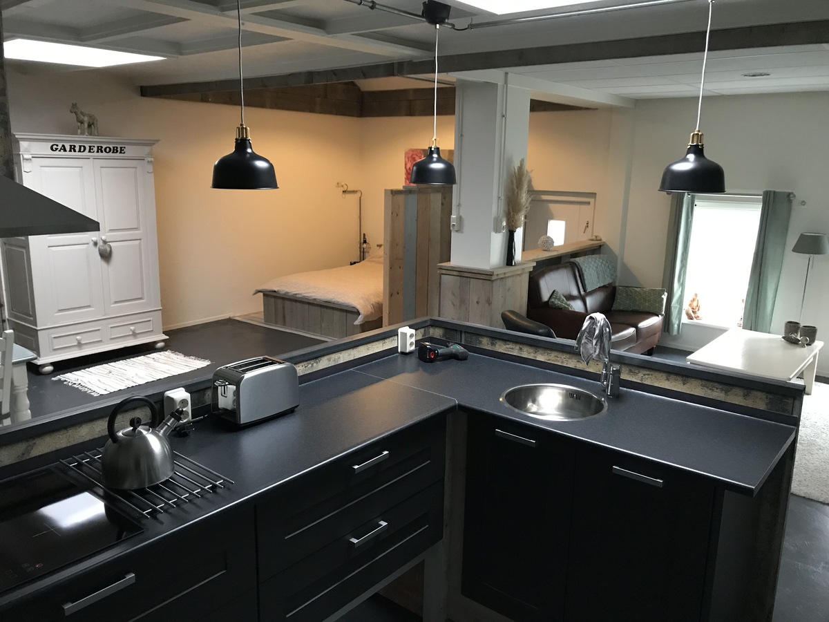 De inrichting is modern, industrieel en behalve de badkamer/wc is alles in één ruimte.