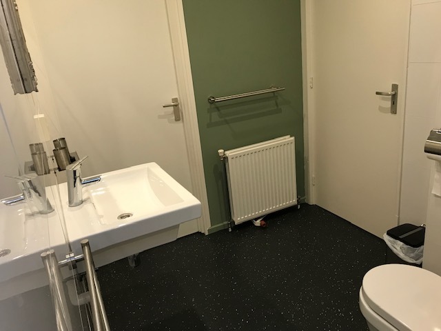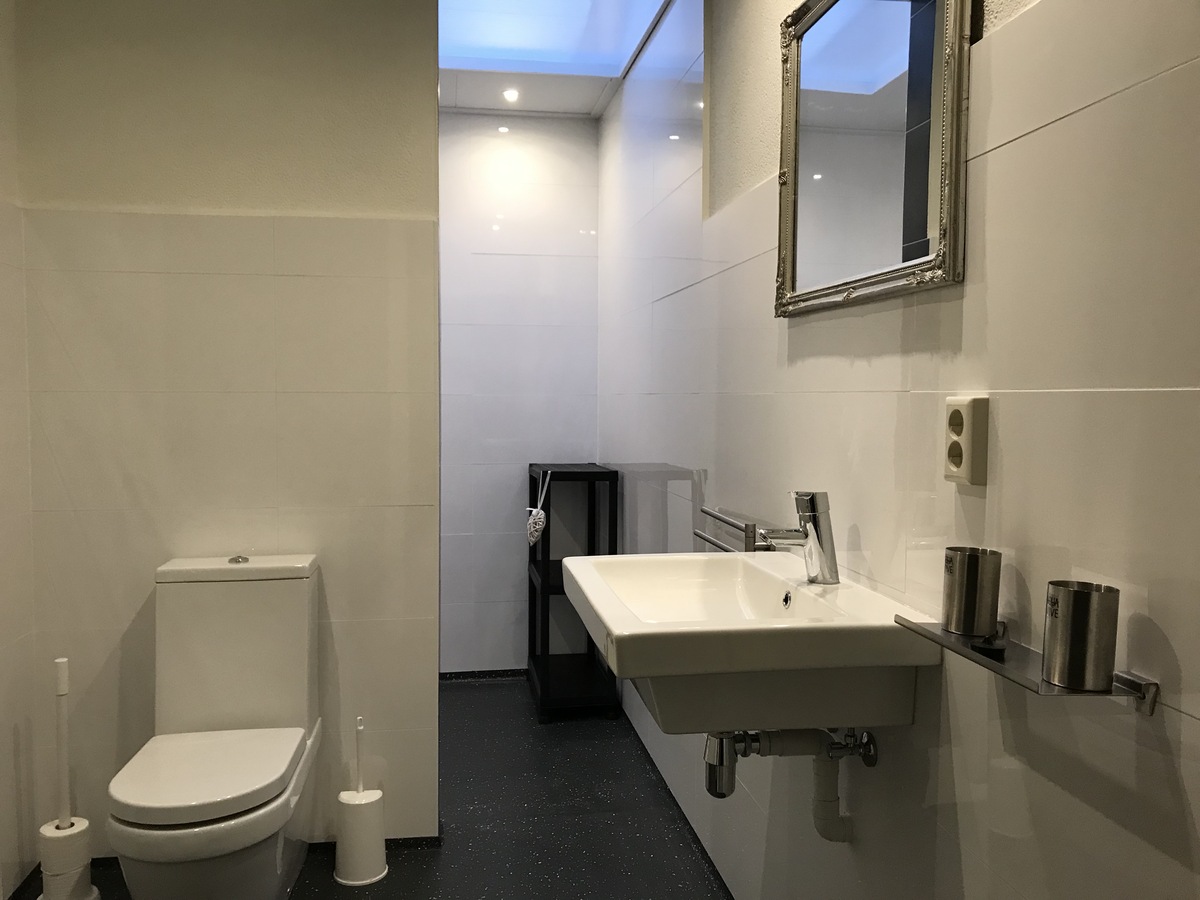 De badkamer is nieuw en zeer ruim met een moderne inrichting.